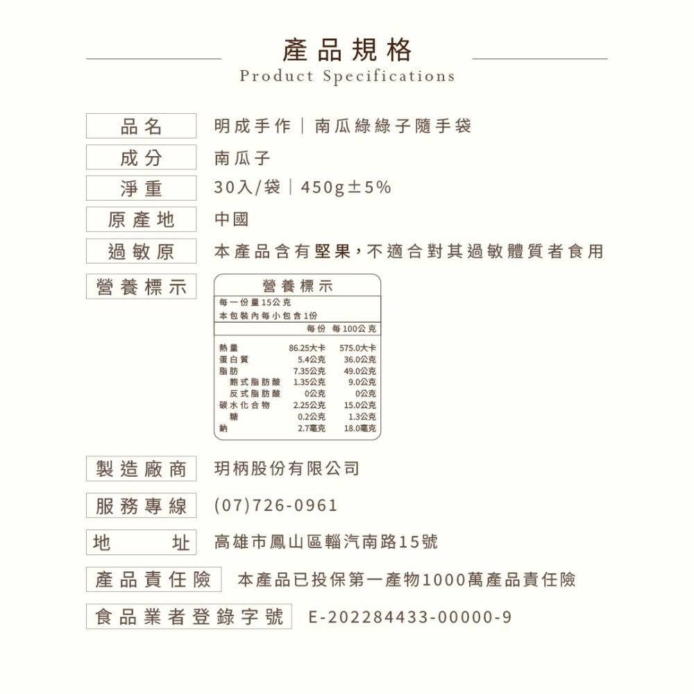 *選用最大顆等級南瓜籽,單吃或點心加工陪襯都美味。*天然無添加 保留原味*輕巧隨手包 方便攜帶*外包裝提袋設計 送禮大方成分:南瓜子注意事項:本產品內含堅果,對此過敏者請避免食用。