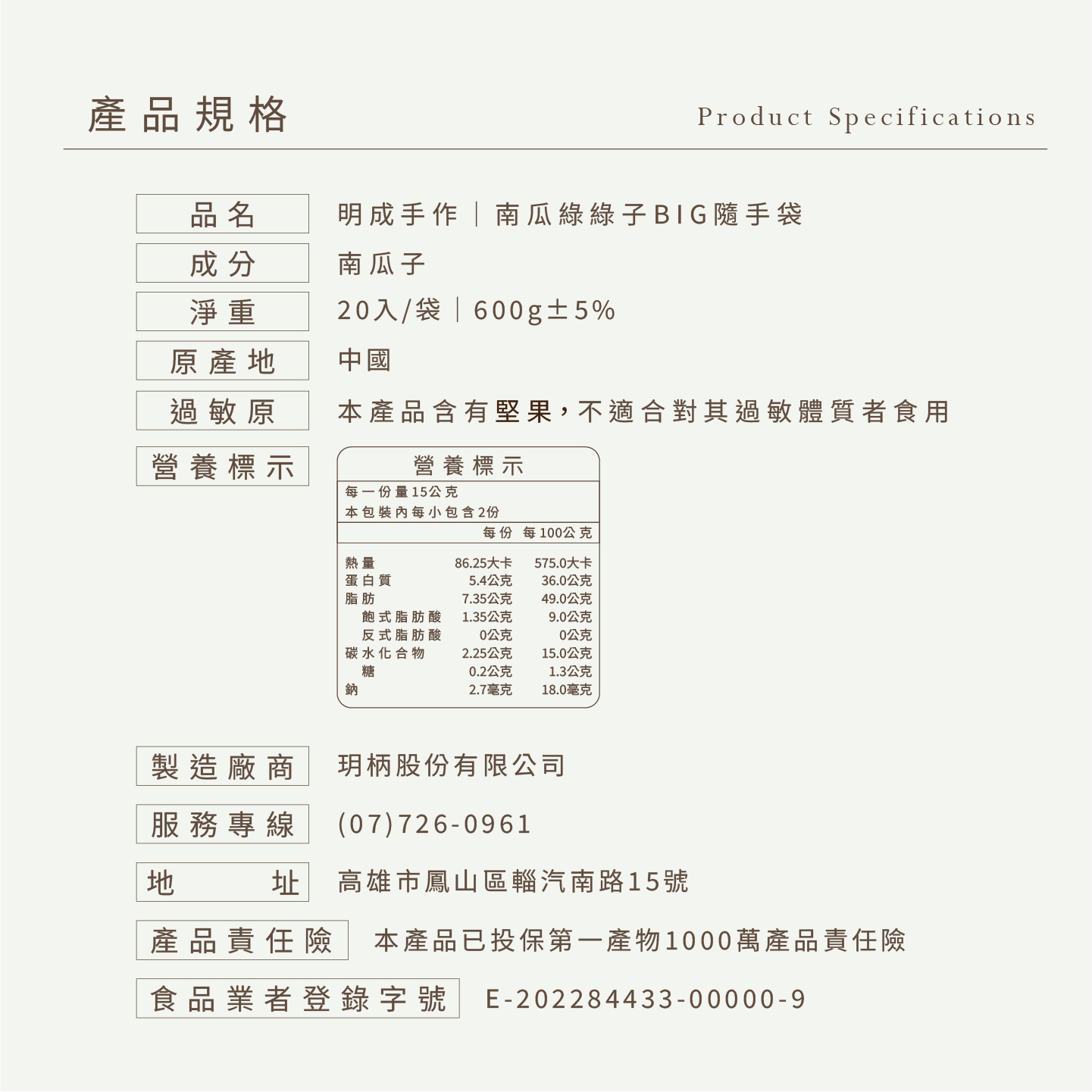 *選用最大顆等級南瓜籽,單吃或點心加工陪襯都美味。*天然無添加 保留原味*輕巧隨手包 方便攜帶*外包裝提袋設計 送禮大方成分:南瓜子注意事項:本產品內含堅果,對此過敏者請避免食用。